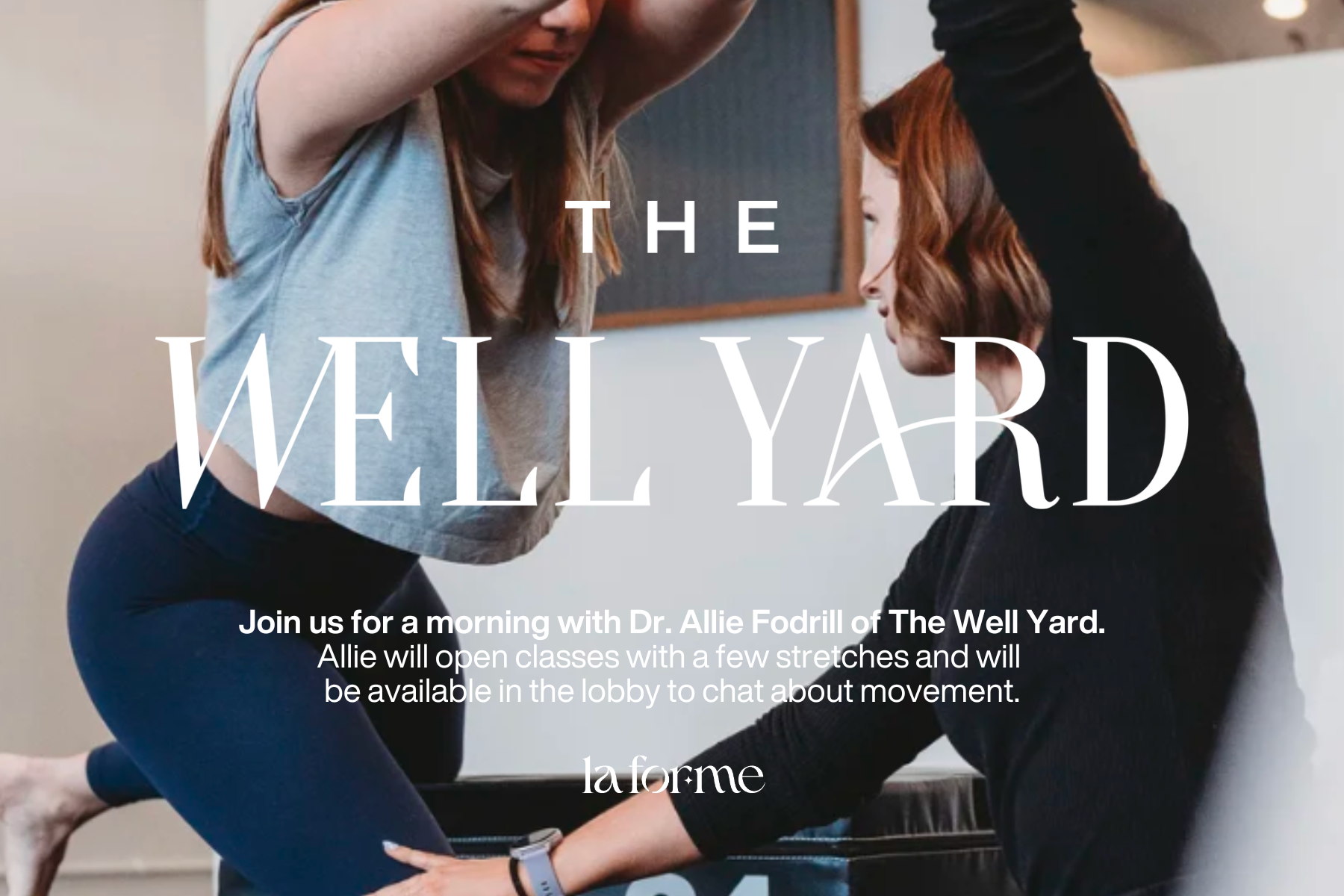 Join us at La Forme for a special pop-up with The Well Yard, led by owner Dr.Allie Foddrill. Allie will guide a functional warm-up before class and be available in the lobby to share how The Well Yard helps people feel their very best through personalized movement, mobility work, injury prevention, and performance-focused care.
